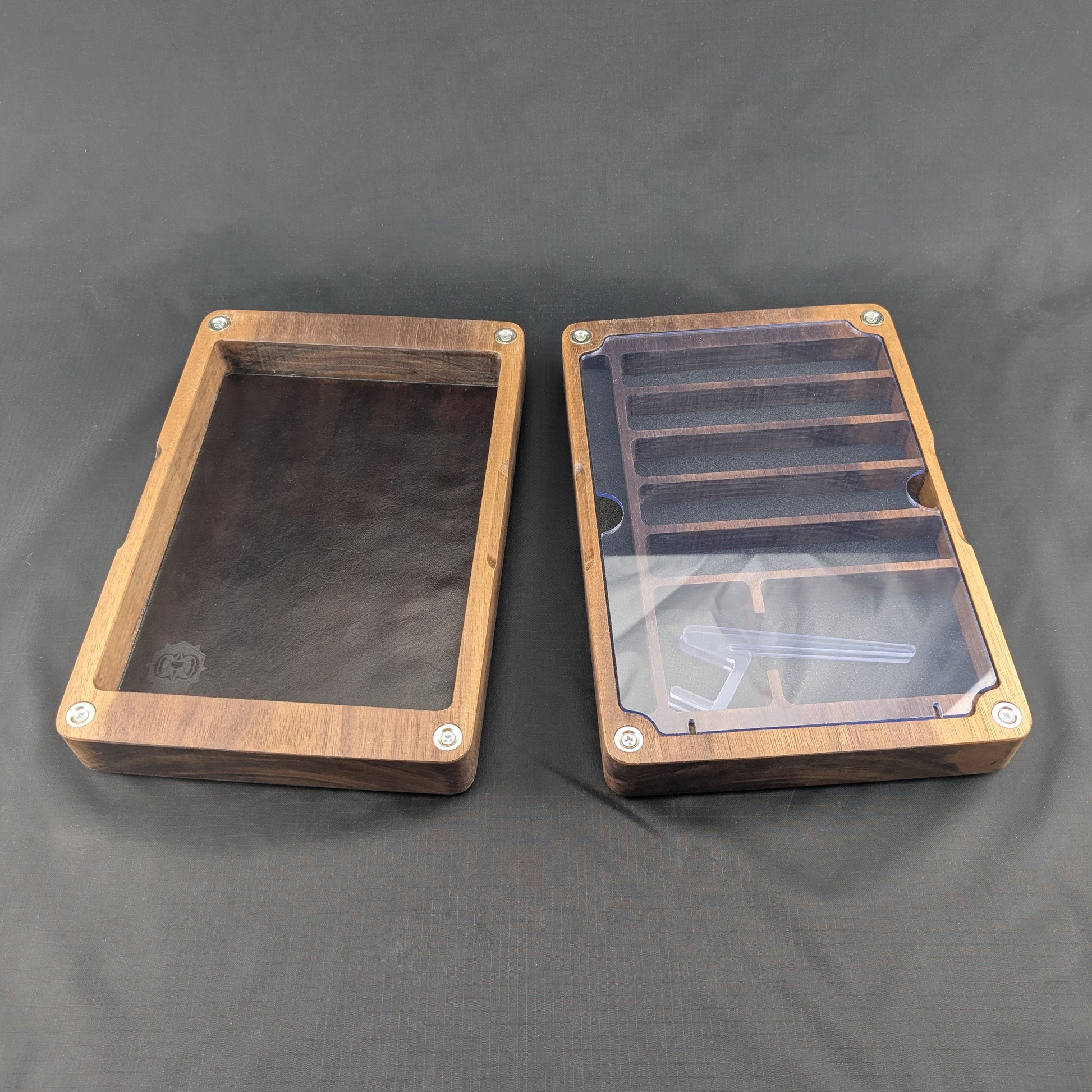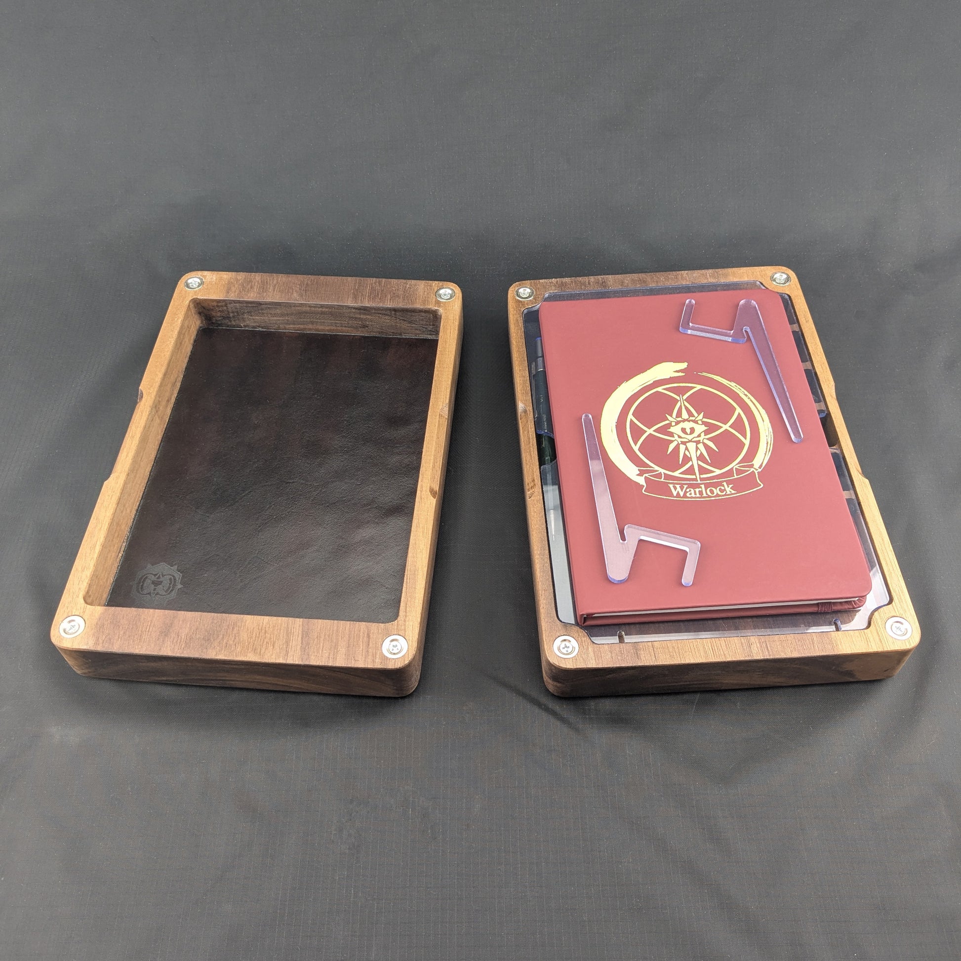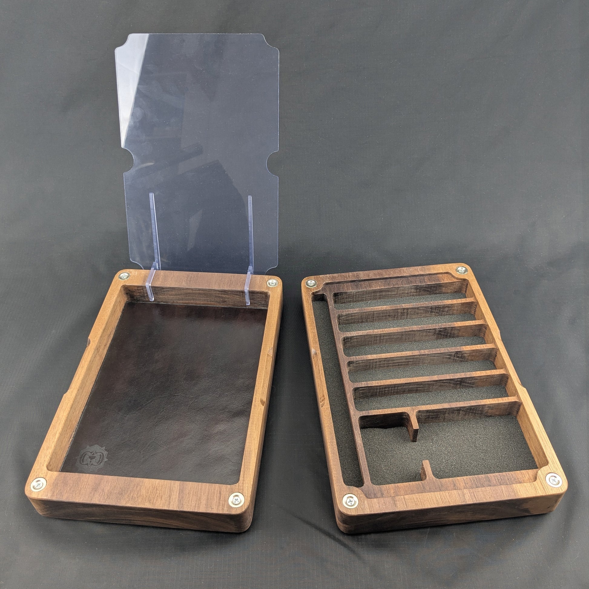 The acrylic screen also has multiple functions, one is keeping your dice, minis and stationery in their place between sessions by fitting in the special groove between the lid and middle layer. You can also take notes on it or write messages on it with a white board marker during your games. The custom made screen holder pieces allow the screen to be placed in the edge of the dice tray/lid for easy viewing. The outer edges of the vault are chamfered for a smooth finish. The side has finger slots to more easily open the vault.