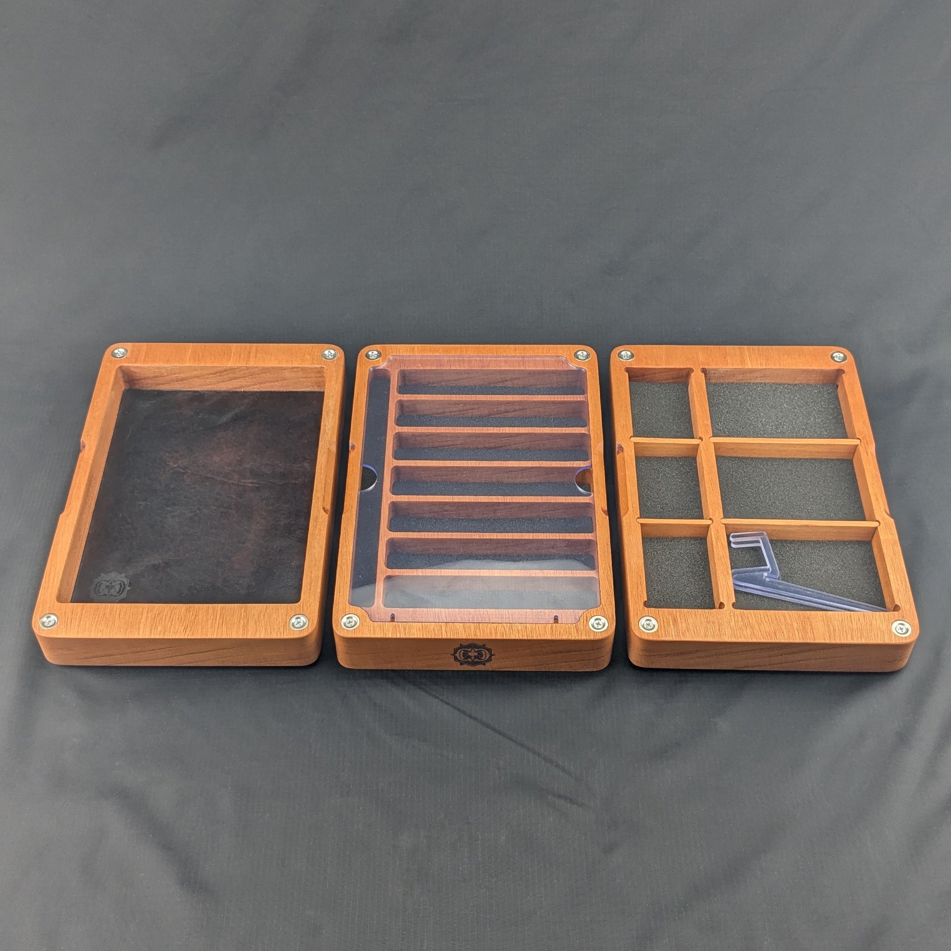 This stunning Fijian Mahogany Master vault has 3 separate parts held together securely with powerful rare earth magnets. The top layer has 3 uses, first of course is as a standard lid that seals the middle layer shut with powerful rare-earth magnets that make sure your dice are stored securely. The second is as a personal dice tray for use at your games, and is also lined with tanned veg leather to give your dice some extra protection from hard surfaces. The last use is a storage place for your A5 note book in between sessions, so when the session is over you can keep all your gear in one place.